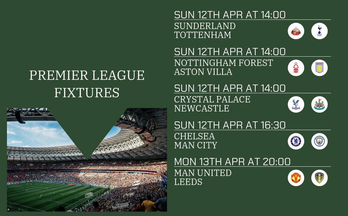 ⚽️Here are the Premier League Fixtures we are showing Today and Monday 13th April⚽️